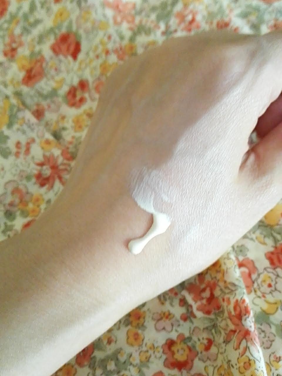 はじめは少し白っぽいクリームなのですが伸ばすと肌に、馴染みます。