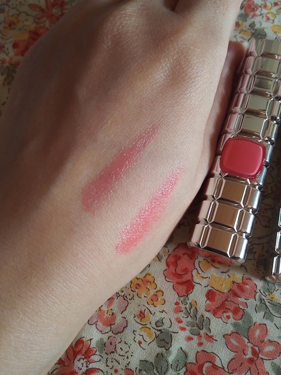 どちらもとろっとした柔らかい感触で唇にフィットします。ただ、今の季節は乾燥気味なので唇が荒れやすい人は上から保湿リップを塗った方がいいかもです。私は荒れやすいので下地にも上からも保湿しないと少し乾燥するかなと感じました。
